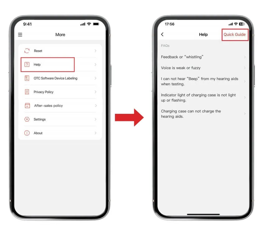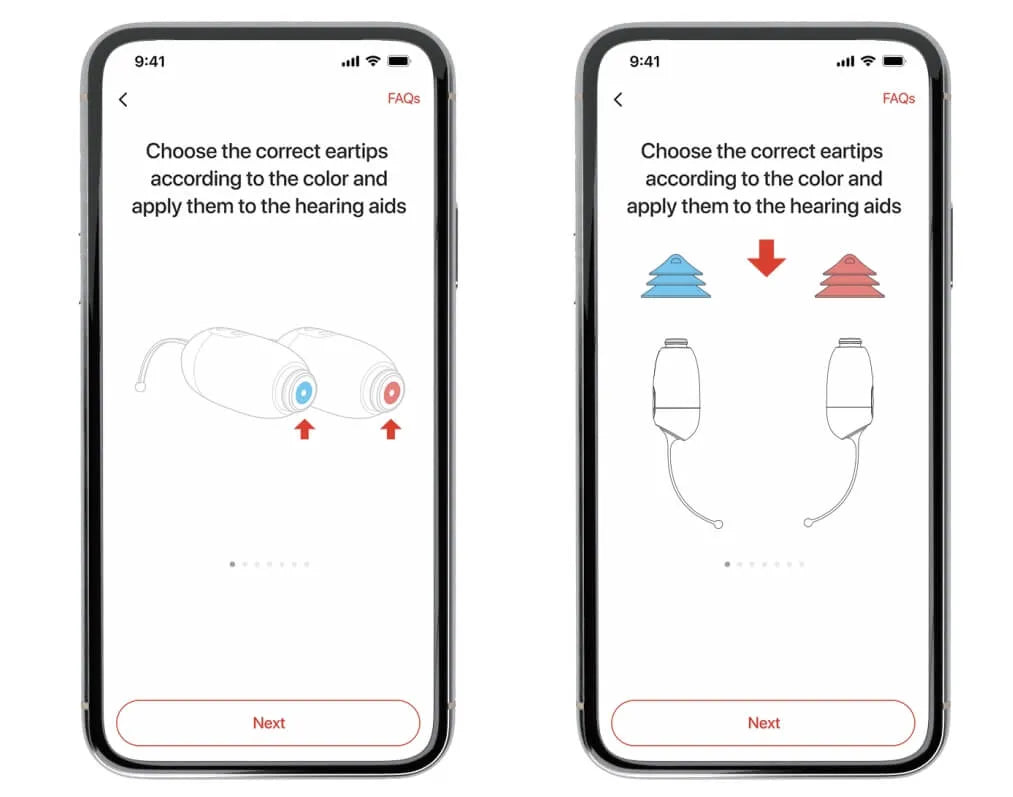 Choose the correct eartips according to the color and apply them to the hearing aids.